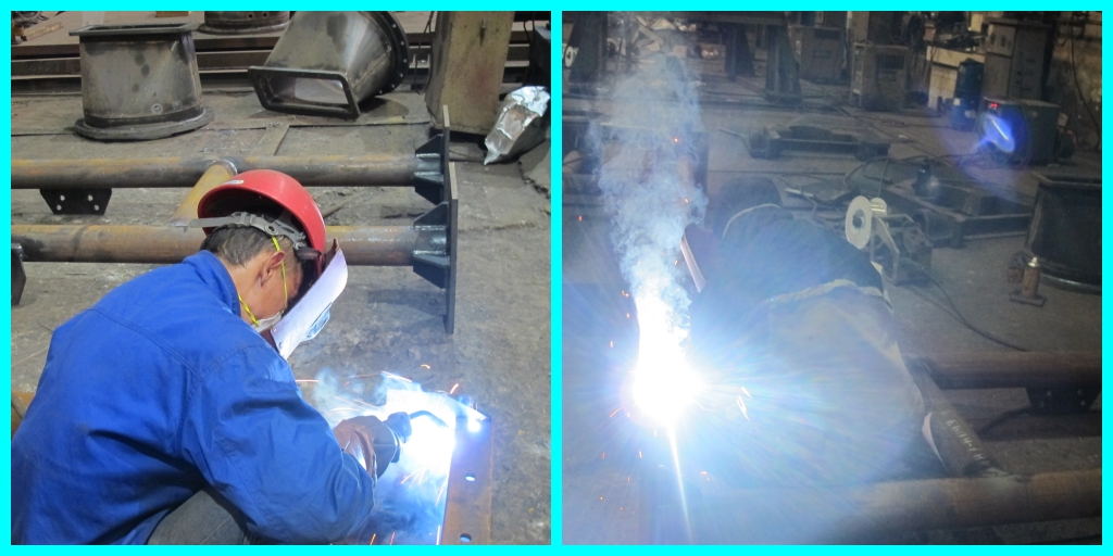 金屬結構分廠,師傅們穿著厚厚的工作服在炎熱的天氣和電焊的溫度下,聚精會神地工作。
