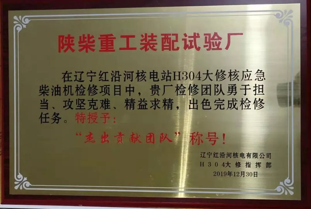 1月9日,從遼寧紅沿河核電有限公司H304大修指揮部傳來捷報,陜柴重工裝配試驗廠檢修團隊在遼寧紅沿河核電站H304核應急柴油機大修項目中表現突出,出色完成檢修任務,被業主授予“杰出貢獻團隊”稱號。