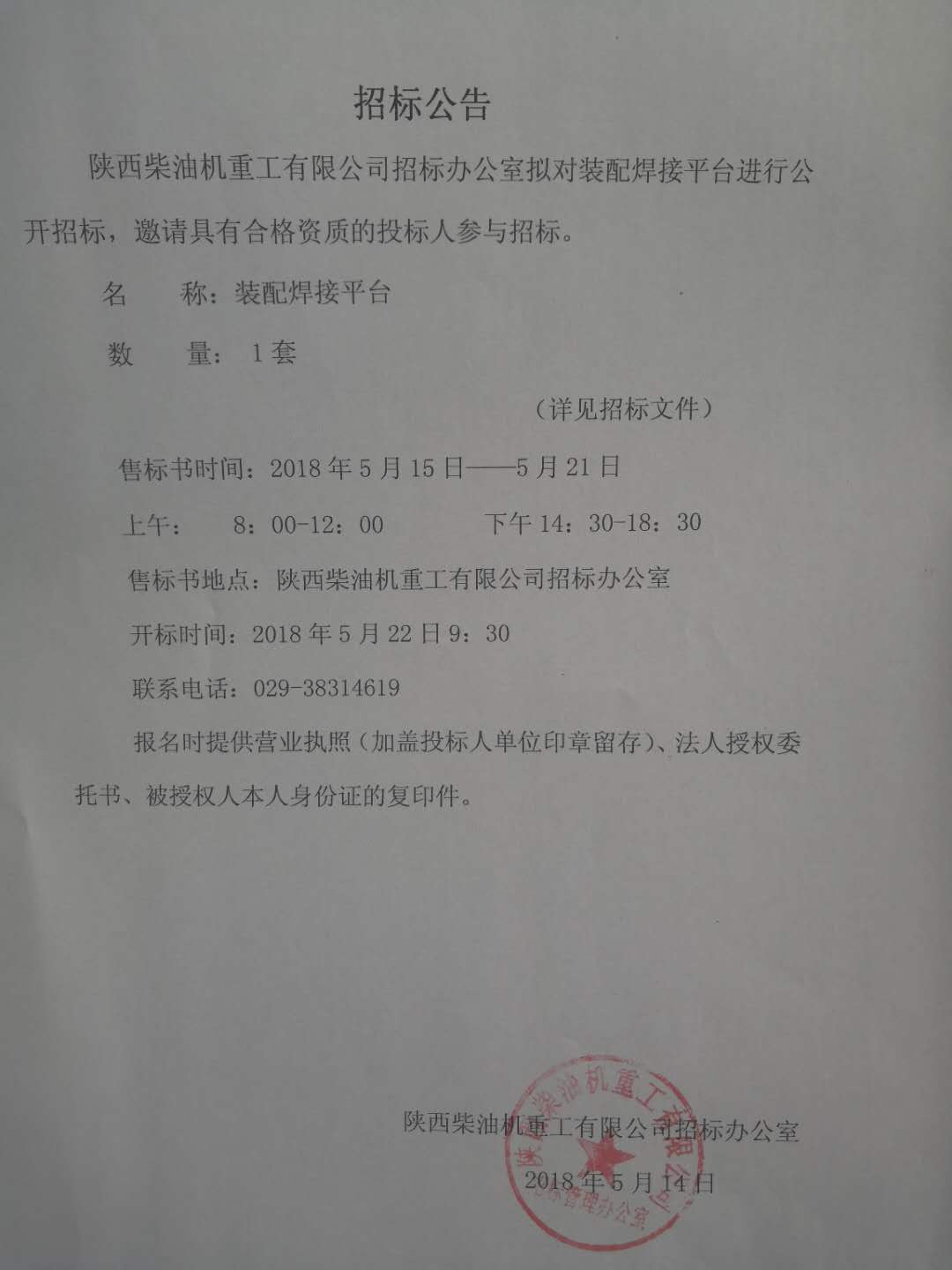 裝配焊接平臺招標公告
