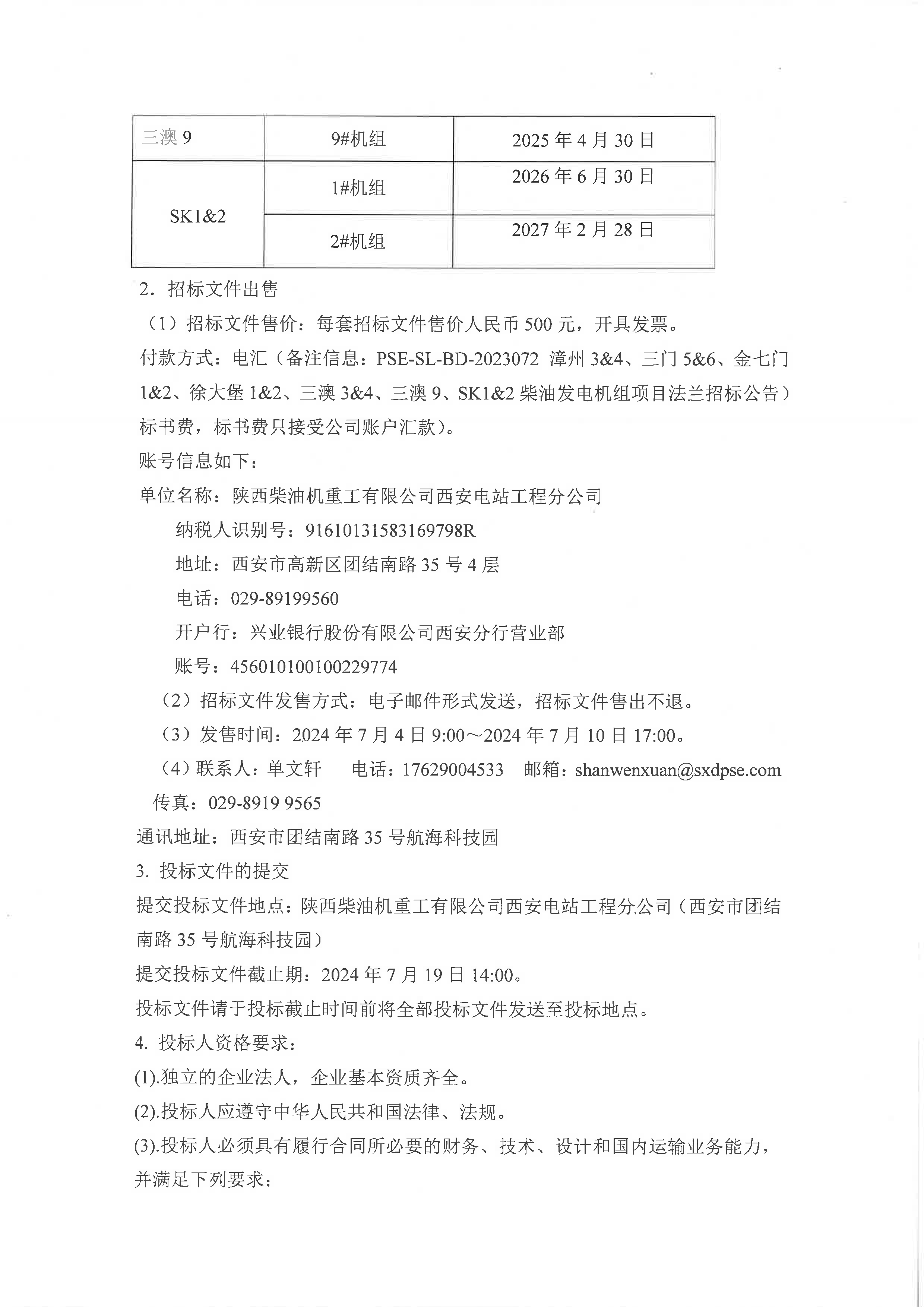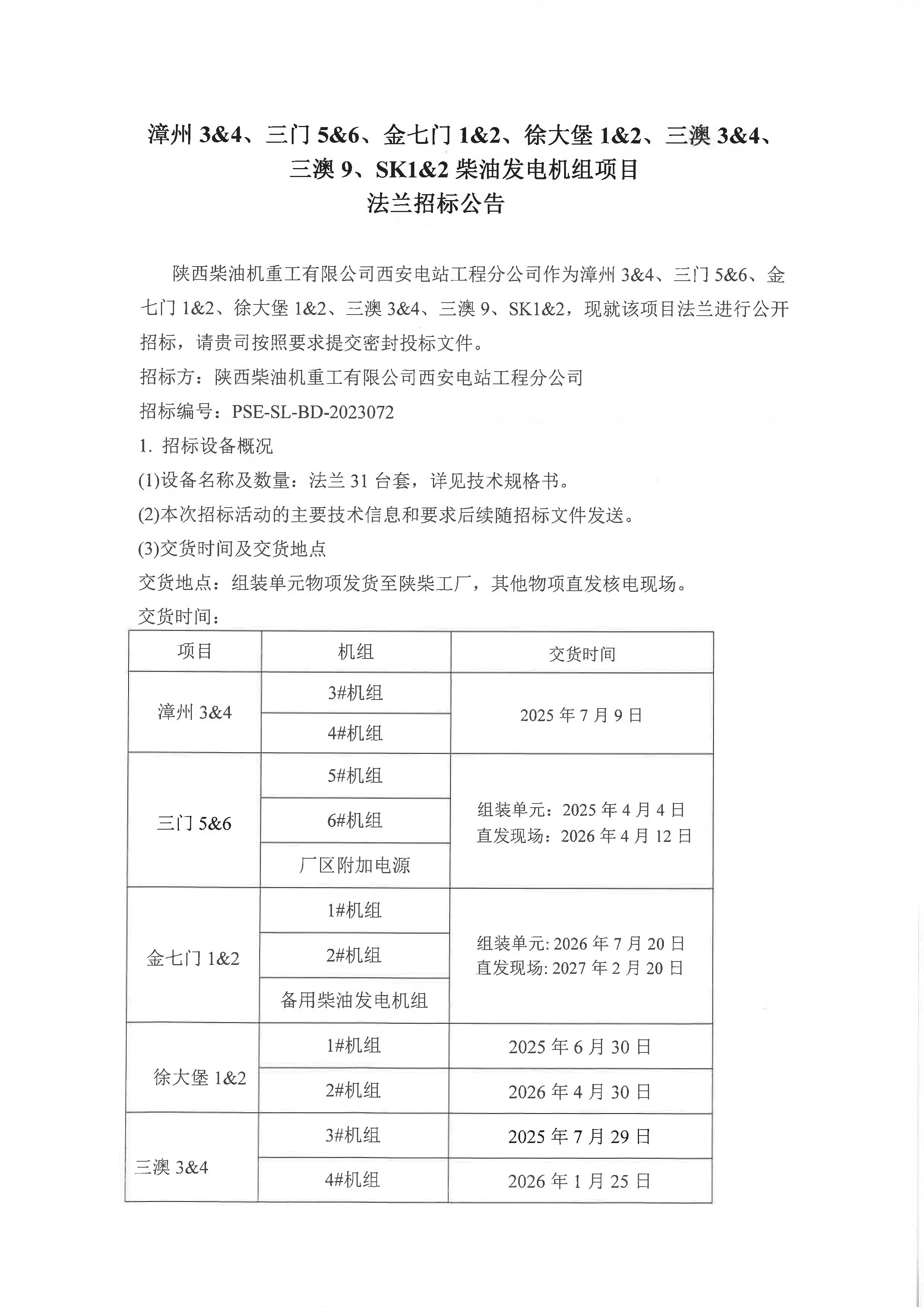 漳州3&4、三門5&6、金七門1&2、徐大堡1&2、三澳3&4、三澳9、SK1&2柴油發電機組項目法蘭招標公告